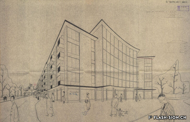 By the mid-50’s, the building complex of la Matze was a pionneer reference in terms of scale and way of conceiving the town in an area still imprinted by orchards. The Raymond brothers together with Marcel and Pierre Kamerzin and Armand Varone founded the Groupement Artisanal (craftsmen union), which was supporting and funding the project drafted by the architect Robert Tronchet: 13 basic goods shops, a hotel, a bar-restaurant and 87 moderate rental price flats. Until 2014 -when it was pulled down- it stood as a shear little town per se. The legendary hall la Matze -with a capacity of 800 seats- remained the biggest hall of the canton for quite a while. Its was opened in 1959 following up fierce negociations, among which promoters came to agree upon a right of way in favour of the Municipality. As to the first dancing ever existing in the plain it was looked upon as a ‘‘dangerous’’ place of ‘‘debauchery’’. First turned down by the Town, it was finally approved by the bishop… under the conditions of temporarily and compulsorily closing down during the Advent and Lent.