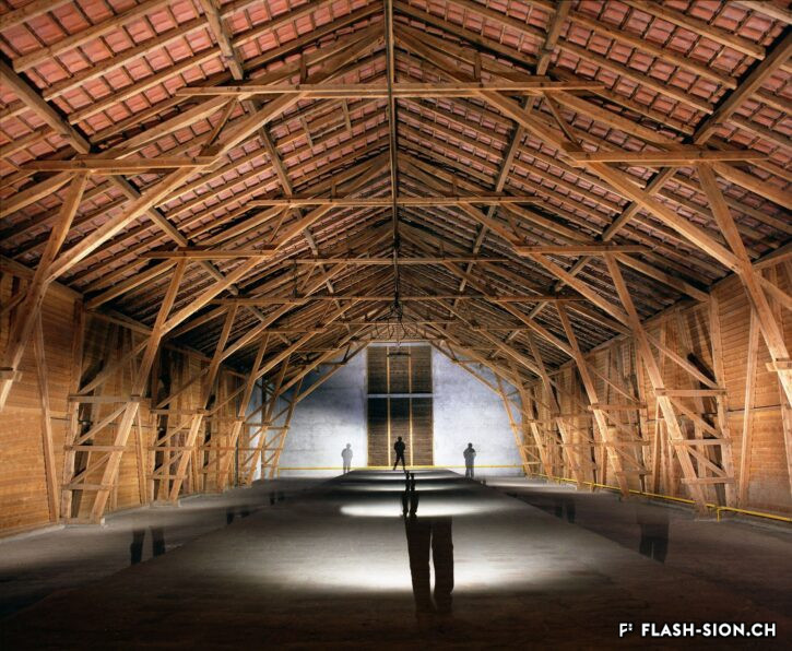The Ferme-Asile was not always the multi-purpose centre dedicated to contemporary art that it is today. Formerly the farm of the Hôpital-Asile, it supplied the hospital of Sion from 1955 to 1984. Left abandoned in the middle of an urban area for about ten years, this unique witness to the agricultural activity of Sion in the 1950s aroused the interest of a group of artists, who saw in it the opportunity to create a multi-disciplinary venue, a vector of cultural synergies. The artistic centre, initially named “Centre Culturel LézArt”, was born and developed thanks to the investment of artists and volunteers. Since 1996, the transformed building has housed artists’ studios and a restaurant. Temporary exhibitions are regularly held there. As funding was received and extensions were built, the establishment opened a concert hall, new rooms and additional workshops. The renovation in 2009 finally made it possible to use the barn with its impressive roof structure all year round.