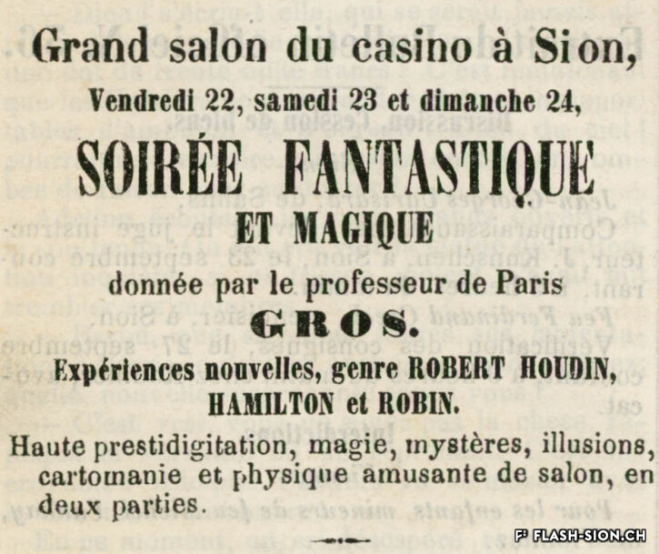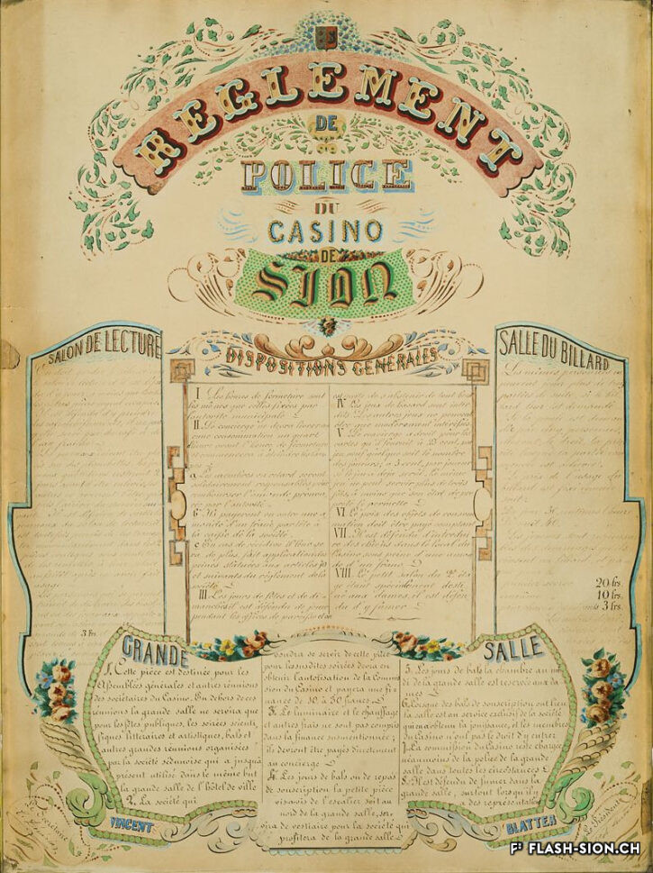 Contrariamente a quanto potrebbe suggerire il nome, il Casinò di Sion non ha mai ospitato i giochi d’azzardo sotto il suo tetto. Destinato a rafforzare i legami della società di Sion, l’edificio rappresentativo dell’epoca, fu progettato dall’architetto Emile Vuilloud nel 1861 per decisione della borghesia di Sion. L’edificio con il grande salone delle feste e le varie sale di lettura e di giochi da tavolo, venne inaugurato nel 1865. Allo stesso tempo venne costituita la “Società del Casinò” e furono adottati severi regolamenti di polizia. Dopo quasi 40 anni di esistenza, la società trova sempre più difficoltà a riunire i membri. Fu sciolta nel 1904 e l’edificio fu acquistato nel 1912 dal Comune. Nel 1924, per evitare di dover fornire, a proprie spese, locali più spaziosi per le sedute del Parlamento vallesano, il Consiglio comunale autorizzò il Gran Consiglio a riunirsi, a suo piacimento, nella sala del Casinò. Ristrutturato e ampliato dal 1938 al 1939, il Casinò divenne la sede permanente del Gran Consiglio, escludendo definitivamente il suo utilizzo parallelo come salone delle feste.