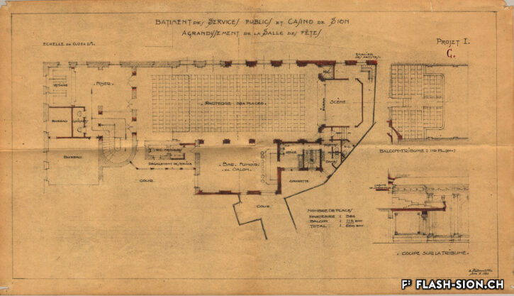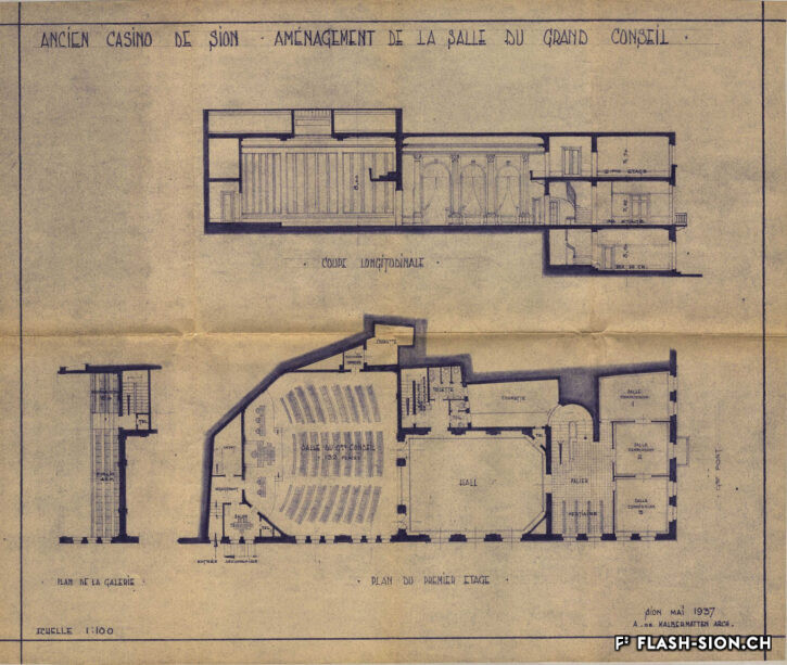 The ‘‘Société du Casino’’ was established concurrently and strict police regulations were enforced. Nearly 40 years later it was becoming harder and harder for the society to attract members, so it was dissolved in 1904 and the Municipality bought the building in 1912. In 1924, the town council -to avoid the costs that would have been encured by renting rooms more spacious for the meetings of the Parlement of Valais- gave the Grand Conseil the permission to sit ‘‘à bien plaire’’ (temporarily, so long as the Conseil approves of it) in the hall oft he Casino. It was renovated and extended between 1938 and 1939 and became the permanent seat of the Great Conseil, thus definitely excluding the possibilities to concurrently use it as a banquet hall.