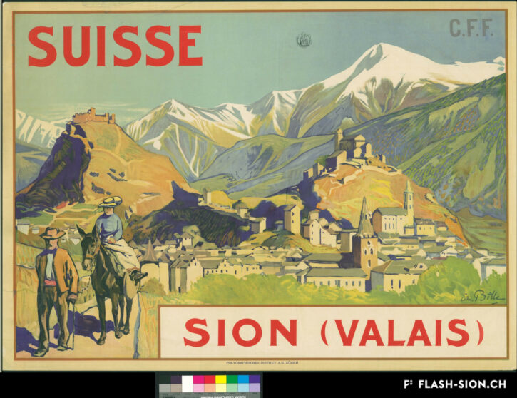 At the end of the 19th and during the 20th century, travel posters were the main means of communication and promotion, bearing witness of the emerging tourism. They contributed significantly to creating the image of Valais, marked by powerful identity symbols. The arrival of the railway made new destinations accessible and ready to be discovered. Travel posters of Valais were highlighting the advantages of cities and resorts as well as emphasizing the natural beauty of the mountains, leisure and sport activities. At the same time, commercial posters were also contributing to the promotion of the canton, for instance of wine producers.