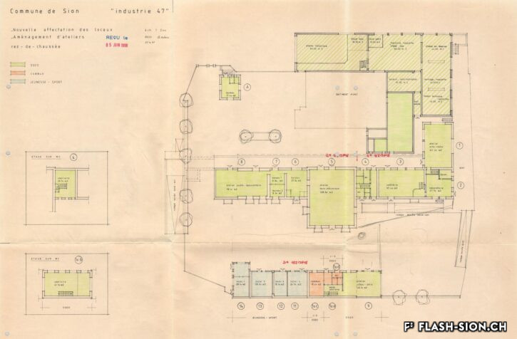 In 1850, municipal slaughterhouses were built under the Majorie rock, in a neighbourhood that was not very populated at the time. With the increase in population at the beginning of the 20th century, these premises no longer met hygiene standards. Discussions about a new building began. During the 1930s, the slaughterhouses moved to the ‘Rue de l’Industrie’, a more suitable location. They remained there for almost 70 years before being forced to close as they were no longer profitable. The building was then taken over by the Swiss Labour Assistance (OSEO, Œuvre suisse d’entraide ouvrière), the Sports, Youth and Leisure Service (Service des sports, de la jeunesse et des loisirs) and some local societies. The departure of the OSEO, at the beginning of 2021, offered the city the possibility of turning it into a venue dedicated to creativity and innovation in the heart of the Ronquoz 21 district.