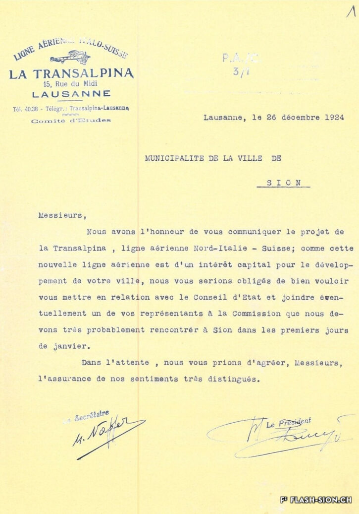 Nel 1925 i voli di prova della compagnia “Transalpina” lasciarono il segno. Il tentativo della società di includere Sion come aeroporto doganale nella rete emergente delle compagnie aeree internazionali venne infine ritenuto troppo oneroso. L’idea di un servizio aereo turistico e commerciale Ginevra-Milano attraverso il Vallese fu tuttavia ripresa poco dopo dall’aviatore visionario Jean Broccard. Dopo il grave incidente di quest’ultimo, l’Ente del turismo di Sion, conquistato dall’idea di creare un aeroporto, si attivò fin dal 1930 e condusse con successo il processo che portò all’inaugurazione dell’aeroporto di Sion nel giugno 1935. A partire dal 1943 divenne l’unico aeroporto della Svizzera in cui potevano essere combinati voli civili e militari.