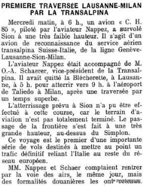 En 1925, les vols d’essai de la société « Transalpina » marqueront les esprits. L’entreprise inscrivant Sion comme aéroport douanier dans le réseau naissant des lignes aériennes internationales sera finalement jugée trop coûteuse. L’idée d’un service aérien touristique et commercial Genève-Milan par le Valais sera pourtant reprise peu après par l’aviateur visionnaire Jean Broccard. Suite au grave accident de ce dernier, la société de développement de Sion, conquise par la création d’un aéroport, se mobilise dès 1930 et mène avec succès les démarches aboutissant à l’inauguration de l’aérodrome sédunois en juin 1935. Celui-ci deviendra, dès 1943, l’unique aéroport de suisse où se côtoient vols civils et militaires.