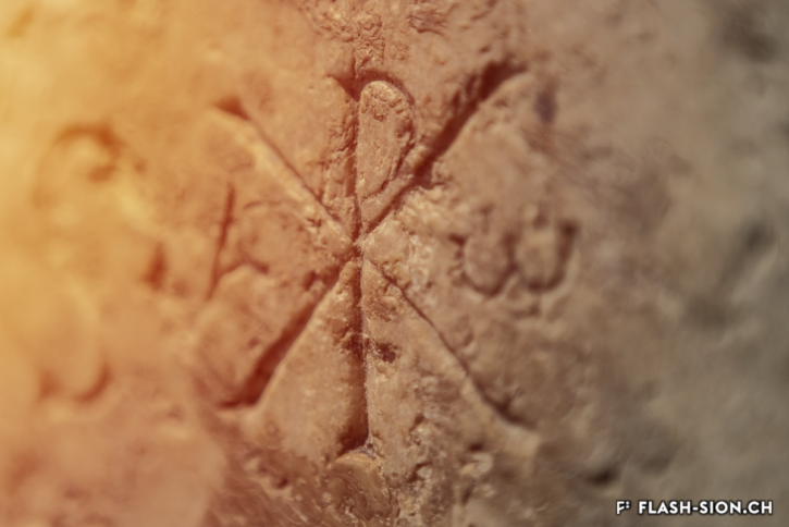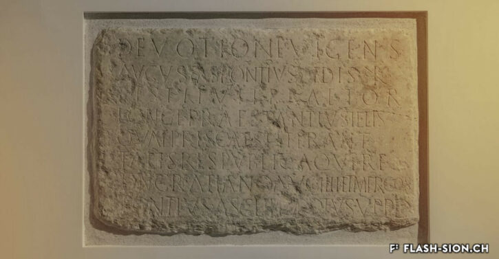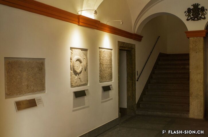 The oldest known Christian inscription north of the Alps is to be found in Sion. Visitors passing through the elaborately sculpted door of the town hall will see that the walls of the entrance lobby are adorned with engraved stone tablets that mostly date from the Roman era. Among them is one particularly important inscription: a dedicatory monogram marking the restoration of a building by Pontius Asclepiodotus, governor of the province, dating from 377.