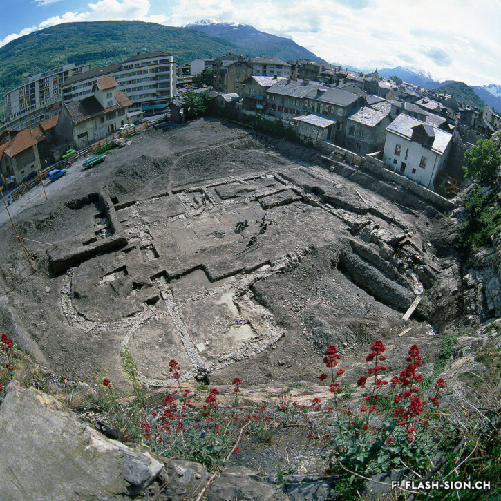 La plus ancienne inscription chrétienne connue au nord des Alpes se trouve à Sion. Lorsque le visiteur passe la porte richement sculptée de l’hôtel de ville, il découvre, sur les murs du vestibule, scellé parmi d’autres plaques de pierre gravées remontant pour la plupart à l’époque romaine, une inscription ayant toute son importance : un chrisme ornant la dédicace de la restauration d’un bâtiment par le gouverneur de la province, Pontius Asclepiodotus, datée de 377.