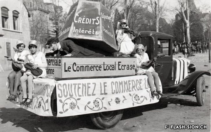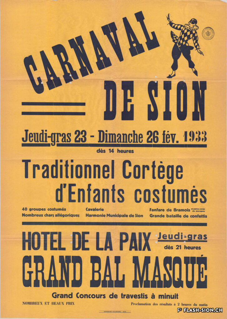 The origins of carnival are rather unclear, but its etymology “Carnelevare”, meaning “to remove meat”, links it to Christian Lent. Carnival, a time of festivities, joy and extravagance before deprivation, lets imagination run wild. Through the use of masks and disguises, people can make fun of the existing social order for a well-defined period of time. To avoid any excess, religious and political authorities used to enforce rules around this celebration. Sion is no exception. In 1849, president of the town issued rules requiring his personal authorization for balls and masquerades. This prerogative was later transferred to the local police. During Carnival, masked balls, theatrical performances and parades were organised in Sion. To make those festivities more acceptable, a part of the incomes was donated to charities. Today, modern carnivals therefore have to balance the excitement inherent to festivities with the rules that have to be respected. The Sion Carnival Association has been meeting this challenge since 1975.