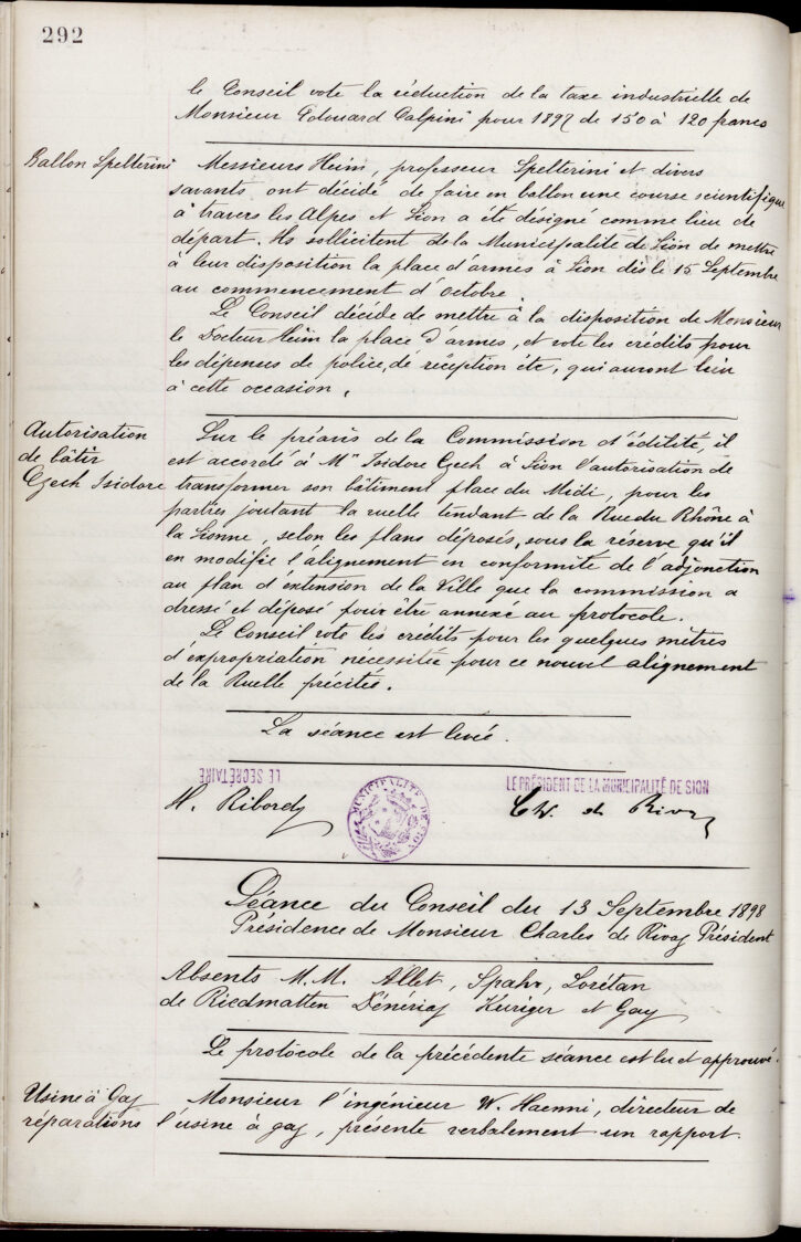 Eduard Spelterini (1852-1931), born Eduard Schweizer, a pioneer of hot air ballooning, became internationally famous for his first flight over the Alps, with the take-off in Sion. At the dawn of 3 October 1898, amazed onlookers gathered on the Planta Square to see cords come off and the «WEGA» airship rise in the air. The golden yellow balloon, held to the ground with more than a hundred and fifty bags, travelled 232 km and reached the maximum altitude of 6300 m. During his flights, the balloon pilot took exceptionally high-quality photographs which allowed men to see the earth from the sky for the first time. Even today they remain an extraordinary testimony of their time.