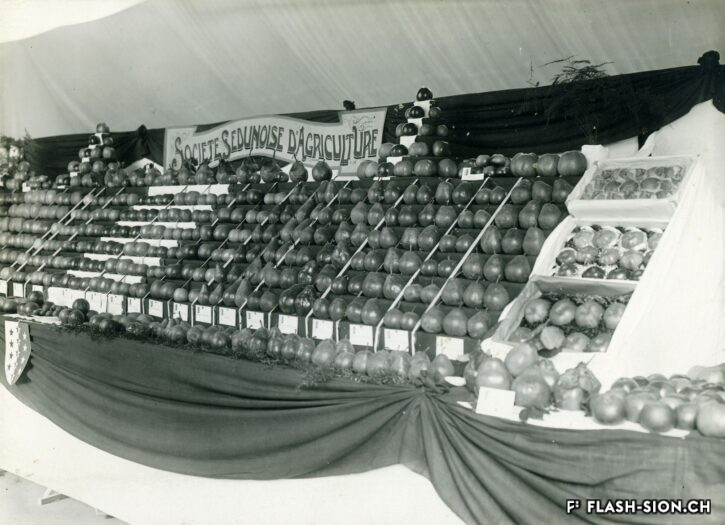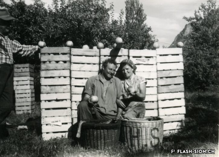 Contrary to what its name might suggest, the Reinette (Monstrueuse) of Canada has its origins in France. It was first described in 1771 by the King’s botanist, Pierre Andrieux. Its introduction into Valais orchards coincided with the first correction of the Rhône River (1863-1894). The land obtained by the draining of the plain offered a particularly favourable soil for the cultivation of this variety. From the end of the 19th century, the Canada apple became the emblematic variety of orchards and orchard meadows of Bramois, from where it was exported all the way to the French capital. Today, the orchards of Sion and Vex are some of the only ones in Switzerland where this old variety is still present and replanted, notably on the grounds belonging to the Bourgeoisie of Sion. Every autumn, the Bourgeoisie offers a crate of these apples to its members. The Canada apple is particularly appreciated for its melt-in-the-mouth flesh and the sweet, tangy taste of its juice.